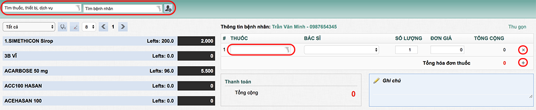 Nhập tên thuốc. Phần mềm sẽ tự động hiển thị danh sách các thuốc có kết quả gần đúng với thuốc nhập liệu. Chọn thuốc từ danh sách sổ xuống. Các thông tin của thuốc sẽ tự động điền vào hóa đơn như đơn vị tính, số lượng, đơn giá