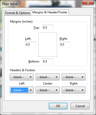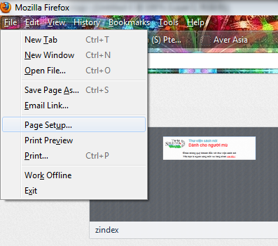 Đối với trình duyệt Fire Fox: Trên thanh Menu của trình duyệt, bạn vào menu file chọn Page Setup. Một cửa sổ bật lên bạn hãy chọn tab Margins & Header/Footer